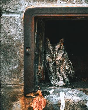 One fall day I went to clean out the chimney to be able to start it up for the first time, and found this little guy sleeping at the bottom of it, seeing in I quickly closed the door ran for my camera and snapped this photo before he woke up the rest of the way and very adamantly flew off in disgust